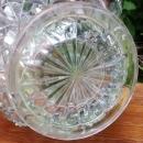 Clear "Solitaire" pattern pitcher made by L.E. Smith Glass Co., 1948-60. Large interlocking 3-dimensional diamond pattern, sparkles in sunlight. Measures 7"h x 5"d. One medium size chip to one of the points on the side; no other significant chips or cracks. Sold as is. Inglenook Antiques...Established 1989.