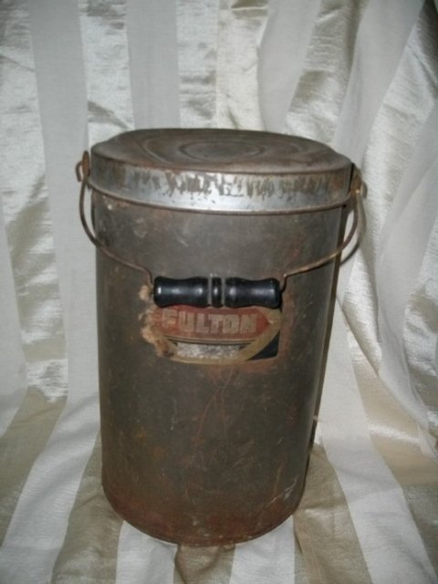 Vintage Fulton metal cream can with a wire & wood handle. It has a large oval Fulton sticker on the front. It is 18 " tall & 8 " across the center.