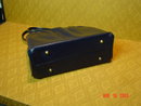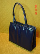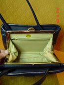 Navy blue vinyl handbag by Garay. It has brass hardware with a hinged closure and snap clasp, and two vinyl handles. The interior is lined with tan vinyl, and has a zippered pocket with the Garay logo in gold below it. On each outer side of the interior are large dark blue acetate lined pockets. This handbag is in excellent vintage condition.