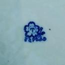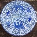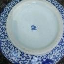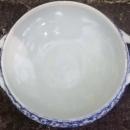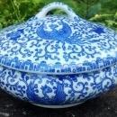 Vintage blue & white "Phoenix Bird" round covered dish with lid, made in Japan. Dates from the 1930s-50s. Mark shows a "T" inside of a plum blossom. Measures 8"d x 5.125" to top of lid; 9.75" handle-to-handle. Excellent condition with no chips or cracks. Inglenook Antiques...Established 1989.
