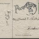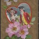 Postcard of Colonial Couple in a Heart Surrounded by Flowers, A Loving Thought. Back is postmarked 1910. Postcard is in good condition, wear at edges