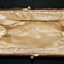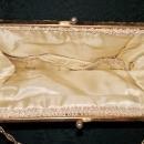 Tapestry chenille purse with chain, circa 1950s. Beige background with multi-color flowers and vines, goldtone frame and clasp. Ivory satin lining. No maker's mark or label. Measures 7" x 5" rectangular. Very good condition with very little wear. Inglenook Antiques....Established 1989.