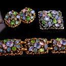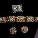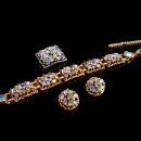 This 3 piece ensemble has rhinestones in all shapes ( Pear, Square, Round, Large and Small). Signed on the earrings. The necklace will go up to 16" long and is almost 1" wide. The earrings are signed and they measure 1" and are clip on. Some wear to the gold color.The brooch is an added bonus. It is in great condition and silver plate. It is a really well made set. Sizes are in the photos so you can see how big each piece is.