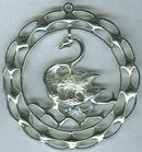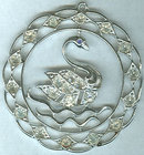 Vintage Rhinestone Swimming Swan Circular Pendant. Silver Tone Rhinestone studded Swan Swimming on wave. Swan has a Blue eye. Pendant is 2 1/4" high and 2 1/4" across. Very Good condition.
