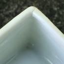 Tettau Porcelain (Royal Bayreuth) square trinket box with slanted sides, hand-painted pink & yellow rose decoration and shaded background. Mark used from 1957+. Measures 2 5/8" square on the lid x 1 3/8"h overall. Excellent condition with only a small pottery separation (factory flaw) inside the corner of the box bottom. Sold as is. Inglenook Antiques...Established 1989.