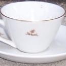 Royal Cup and Saucer. Cup and saucer have gold trim and Scattered small brown trees. Cup is 2" High and 3" Across, Saucer is 4 3/4" Across. Cup and saucer are in good condition, gold does have some wear.
