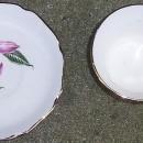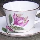 Vintage Sabin China Cup and Saucer with Large Pink Tropical Flower and Gold Trim. Cup is 2 1/2" across and 3 1/2" high, Saucer is 5 3/4" Across. Good condition, glaze does have some crazing.