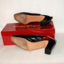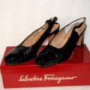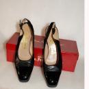 Vintage Salvatore Ferragamo Black Patent Calf Leather Sling Back Pumps Galizia Florence Italy . They come with the original box and are pre-owned and have been worn but in really nice condition. There are some black marks to the tan lining of the foot bed. And some wear to the sole but the heal is not worn down at all. The leather is flawless.