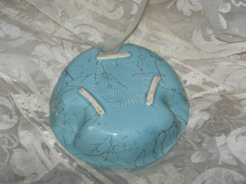 Vintage pottery ashtray with a aqua glaze & a spaghetti string design. It is marked E.R. Lane Vannuys, Calif. Pat No 175968 It is 7 1/4 " & 1 3/4 " deep.
