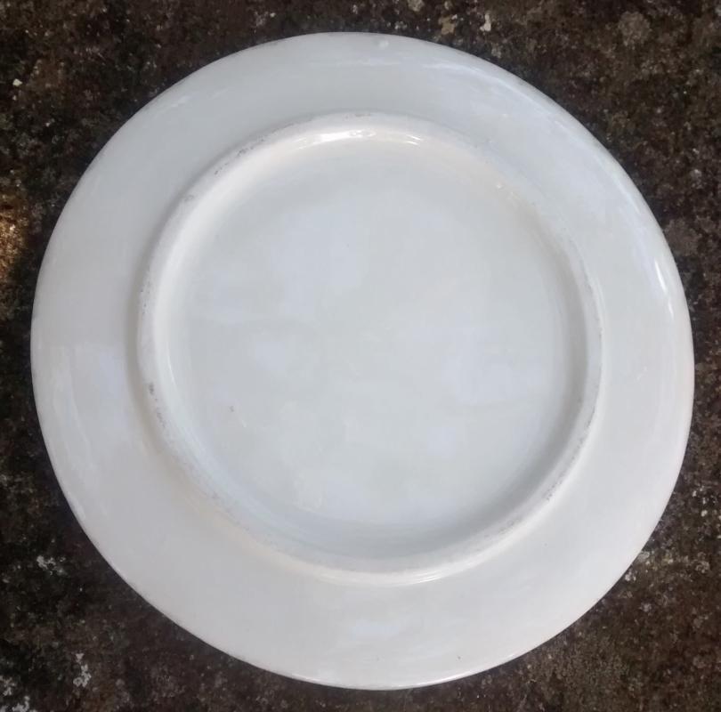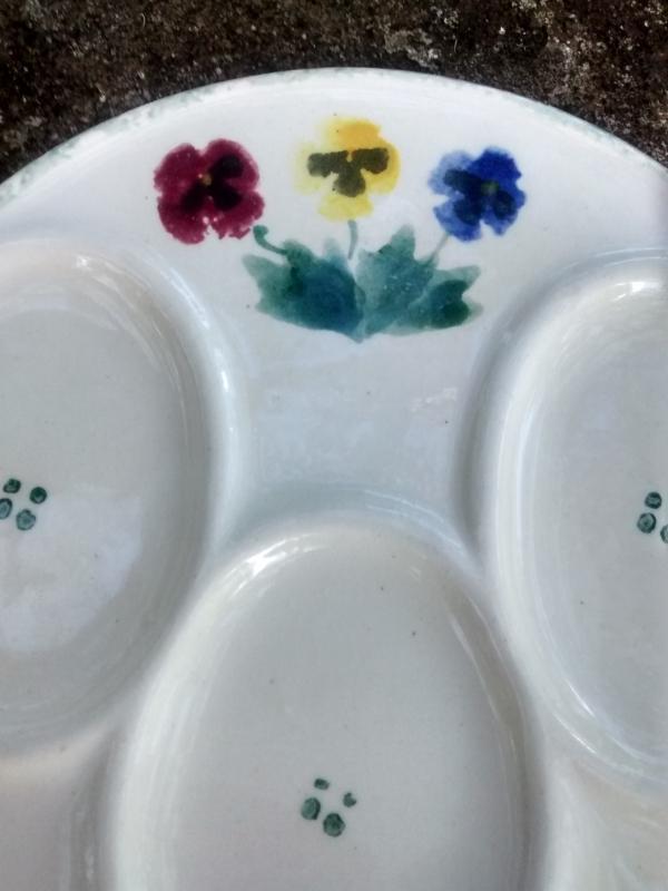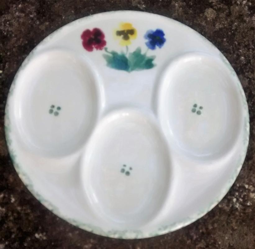 "Pansy Green" spoonrest with 3 depressions, made by the Crock Shop of Santa Ana, California. Hand-painted with red, yellow and blue pansies, green leaves and green sponged edging. No mark. Round shape, measures 6"d. Good condition with very little wear. Inglenook Antiques...Established 1989.