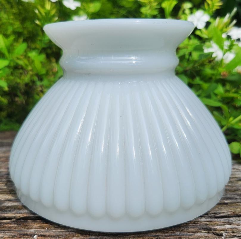 White glass student-style lamp shade with vertical ribbed body, plain upper rim. Measures 4"h, with a 6" fitter (bottom rim); 2"d opening at top for chimney to pass through. Good condition with no chips or cracks. Inglenook Antiques...Established 1989.