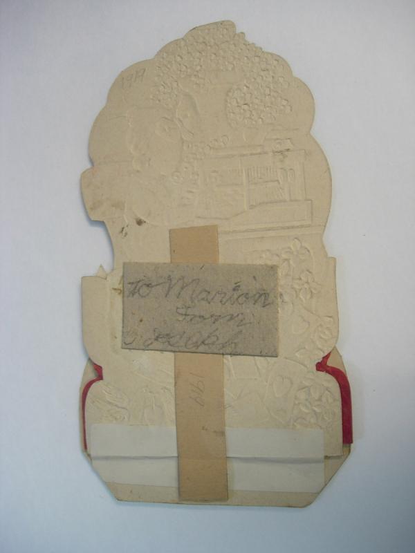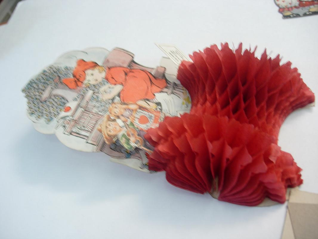This is a Vintage Valentine Accordian Die Cut Fold Out Mechanical Paper Doll Greeting Card. A cute young girl is sitting at a typewriter typing love notes. The notes are in an red accordion fold out and say "To My Valentine May this give a pledge to thee. And speak in silence Love from me." On the front it says To My Valentine. On the back it says hand written in pencil "To Marion From Joseph" and 1919. Sold as found.We are not greeting card experts. This greeting card is in good vintage condition. It measures 4 1/4" by 7 3/4". Fold Outs
