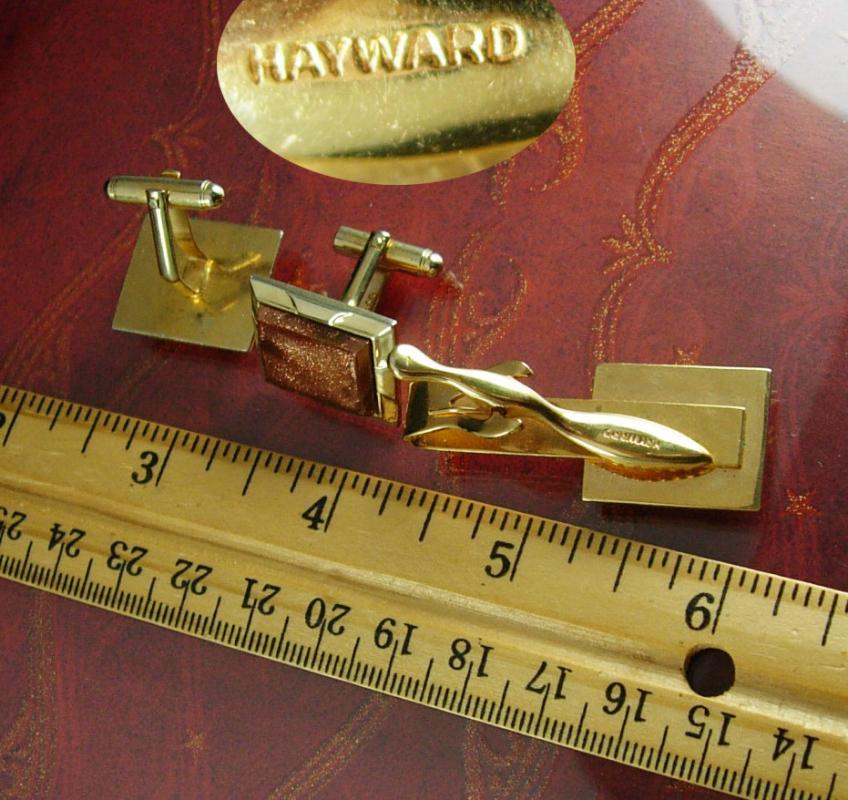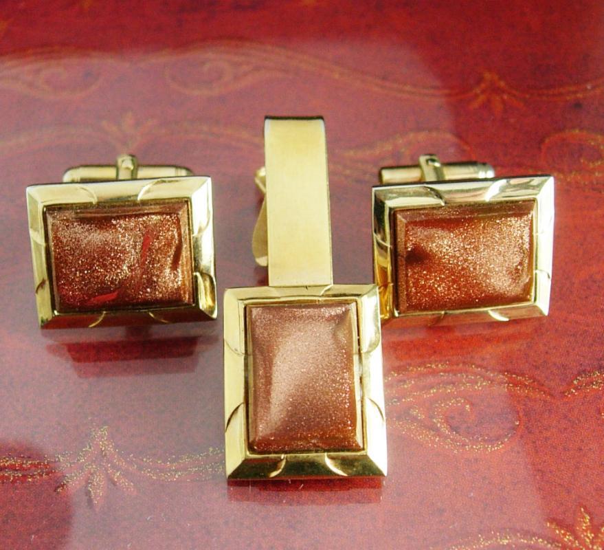 This cufflink set is absolutely gorgeous! Stunning goldstones with rippled borders complete with matching tie tack. This is the time to be thinking of the perfect gift for that special occasion. What better way then that something for the men that have everything! This would be a great idea because it is Vintage and not something you can buy Everyday. OR perhaps Just A perfect addition to a collection. Old World Folklore Goldstone has been around for centuries and was presumed discovered by accident in the 17th century Venice by the Miotti family. Old World folklore attributes the discovery of Goldstone from an old monastery where monks were trying to make gold out of other materials, specifically alchemy. Molten copper was tipped by accident into a crucible of molten glass and crystallized out in tiny bright triangular crystals and forming a melt from which objects with golden light could be formed. It has an alternate or folklore name of ‘Monk’s Gold’ or ‘Monkstone’ from this discover before it was named Goldstone due to the starry internal reflections of the stone. Properties Though Goldstone doesn’t have any associated birthstone or anniversary, it does however have some associated properties. Goldstone is associated with vitality, energy and the uplifting of a persons spirits. It is known to help to reduce tension and believed to be helpful in securing love, protection, riches and inspired diplomacy. It is found in the United States, India and Russia. Has a symbolic meaning for Ambition and Drive. Blue Goldstone is a stone for wisdom and science Red/Brownish Goldstone is a stone for physical stimulation . Goldstone Gemstone meanings also Red goldstone is associated with vitality and energy. Blue Goldstone is associated with learning and communication. Green Goldstone is associated with growth and abundance. Goldstone is a man made gemstone that has been around since the European Rennaissance. Early monks working at a glass factory near Venice, Italy were practicing alchemy when molten copper accidentally tipped into a molten glass container. This crystallized into thousands of tiny crystals and formed a melt with golden light sparkles. This is how the first goldstone came about. Though it is not technically a gemstone, it is often referred to as one. Goldstone is an energy stone. Boxed for gift giving; gift wrapped on request. ∆ Maker: HAYWARD ∆ Material: gold plated metal, goldstone gemstone ∆ Size: see photo ∆ Weight: medium ∆ Condition: In good vintage pre-owned condition. ∆ Lovely patina! These are part of a MASSIVE estate collection of cufflinks and jewelry so be sure to check out our other items here: https://www.etsy.com/shop/NeatstuffAntiques?section_id=all We don’t polish these previously owned well loved pieces so we can keep the original patina. We try and photograph all of the pieces next to a ruler so you can see the actual size. All jewelry sold as found. NOTE TO BUYER: We Do not offer engraving services of any sorts as we are not equipped to do so I’m sure your local jeweler would be happy to do so, sorry for any inconvenience thank you. All cufflinks ( unless otherwise specified) are considered costume jewelry. We use the descriptions of any stones from the manufacturers titles when they were first produced. When we refer to the stones as moonstone or jade or garnet, for example, we are using how the original manufacturer of the pieces used them. We cannot guarantee the authenticity of a stone in a costume piece of jewelry. ***ATTENTION!*** Shipping rates for domestic and international delivery have skyrocketed! I have adjusted the shipping rates accordingly. If you wish to have another method of delivery (i.e. First Class International) PLEASE let me know before placing your order. My goal is to save both of us money on shipping. june23 2015