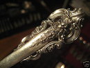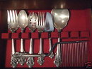 Wallace Grande Baroque Sterling Silver Flatware Set 79 Pieces with Storage Chest.This auction includes: 12 luncheon knives 8 7/8" 12 forks 7 3/8" 24 teaspoons 12 salad forks 12 cream soup spoons 1 cold meat fork 1 serving spoon 1 pierced serving spoon 1 large serving fork 1 small cake server 1 large berry spoon 1 cake breaker This set is in fine original condition with no signs of repair and comes with wooden flatware storage chest!