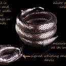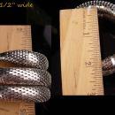 This wide 3 coil vintage snake bracelet is a Whiting and Davis signed bracelet It is a very good quality piece that has 3 very wide coils. The bracelet will fit most any wrist due to the flexible design . The smallest it is when not worn is 2 1/4" in diameter. Could be worn on the upper arm as well as the wrist. . The goddess in your will appreciate having this serpent protect her. The coil is good and sturdy and the bracelet is in its original coil shape. Very good condition.