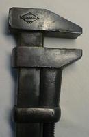 This is a very nice machinist's knife handle adjustable wrench. It's marked with a diamond shape logo with the letters W & B CO. at each corner of the diamond, Made in USA it printed throught the center of the diamond. The knife handle feature is very nice on this wrench, with a 2 piece wood handle. The wood is in good shape with a minor grain split in each piece. The handle is very solid, in good working condition and looks good as well. The jaws are very straight as well as the bar stock and threaded shaft. A very nice larger size monkey wrench for those big jobs!