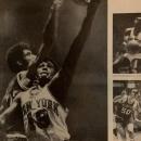 Willis Reed New York Knicks 1970 Article. This 3 page black and white 1970 May 1, 1970 article states The Team it took to beat Big Lew. Pictures shows Willis Reed on Bench, and eluding outstretched hand of Lew Alcindor. Also shows Walt Frazier driving for a basket, Cazzie Russell and Dave DeBusschere muscles past Len Chappell. Magazine tear sheet picture is taken through plastic and may show wrinkles or crookedness that is not in the ad. This original magazine tear sheet measures 10 inches wide by 13 1/4 inches tall.