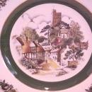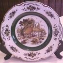 This is a very nice top quality Ironstone service plate marked "ASCOT SERVICE PLATE BY WOOD AND SONS ENGLAND ALPINE WHITE IRONSTONE" on the back mark. This plate is 10.7" diameter and has a thatched roof cottage village scene, with gold and floral highlighting. We note no scratches, no chips or cracks, no crazing noted, the gold highlighting is about 99% intact, very little wear overall.