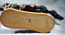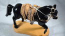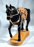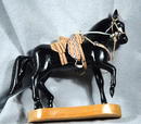 Wooden & painted black Horse Carving. Has an wooden & leather saddle with metal stirrups.