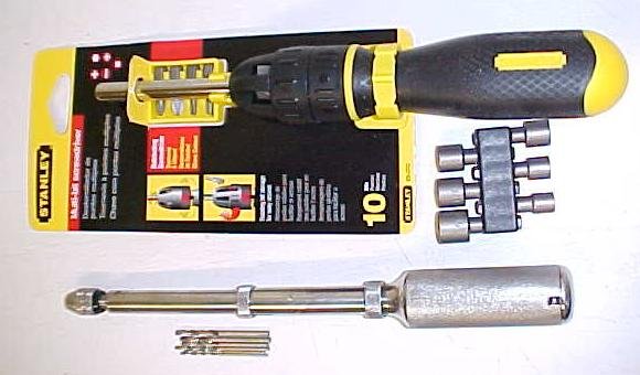 Offering this special deal of a used Stanley Yankee push drill with the latest straight shank adapter, and the New Stanley hex drive ratchet screwdriver, w/nut drivers set also as a bonus! First is a quality used U.S.A. made, professional, all metal Yankee push drill marked "YANKEE No. 41 or 41Y U.S.A." on the chrome plated steel shaft, and has been fitted with a small, precision keyless screw chuck to hold small standard straight shank drill bits. This used hand drill comes with 6 spiral drill points (bits). Yes, this means that you can use any straight shank drill bit from 1/32" to 1/8" diameter straight shanks, with this Stanley (or North Brothers) No. 041 push drill! We supply a total of 6 drill different bits that not only fit into the keyless chuck on the push drill, but also fit into the handle storage area too! The supplied spiral type drill sizes will be 3/64", 1/16", 5/64", 3/32", 7/64, & 1/8" diameters, included in the price of the drill. This push drill features the hollow steel handle with an spacer inside to store up to 10 drills. Simply push the handle to drill your holes. This one has a spring loaded type chuck that holds the drill bits in place, works great. Measure 10" long. The keyless chuck, and drill point for it are all new. The spiral drill points are good for drilling sheet metal, plastic, and other materials, not just wood. Also included, you get the Stanley 10" long, multi-bit ratchet screwdriver, 68-010 with the ergonomic rubberized metal handle, (metal w/plastic end cap and rotary switch and storage) and also has storage for up to 6 of your favorite bits in the front section of the handle. A total of 16 bits comes with this package deal to fit this screwdriver. You get various sized Phillips, slotted, square drive, and star drive bits, plus 6 nut driver bits in sizes 1/4 to 7/16", making this a super versatile tool package for so many of the around the house or shop projects! The screwdriver is super well made, the best grip of any of the screwdrivers that I own, and has become my personal favorite for most small projects! The ratchet feature is controlled by a rotary switch in the center of the handle, for clockwise, lock and counterclockwise positions. The handle has flats on it, so it doesn't roll off the work bench, like many of my old screwdrivers do, and that rubberized grip is the best grip I have on any tool like it. What is really nice about both of these tools it that you can put them in your work pouch and since they have tool bit storage, you don't have to get back down off the ladder to get the bit you need to install or remove that accessory. The screwdriver also has a wall bracket to hold the screwdriver and 4 of the included bits. We know you will be pleased with your purchase of these quality made tools, and we have little doubt that you will pass them along to your children and friends. Makes a very nice gift and any handyman!