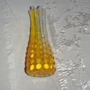 Yellow Clear with Moonglow Crest Ruffle Hobnail Stretch Glass Vase , Japan. Very nice and sunny stretched glass or swung glass but vase made in Japan. It has a lot of different stuff going on. At the base here are big, bubble hobnail like protrustions that get small going up that evolve into panels. The yellow has a effect of streaks. Then there is a white moon glow rims. The vase is in excellent condition.