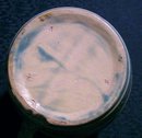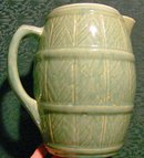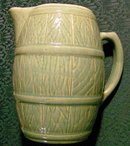 Zanesville Stoneware Company's #43B barrel form pitcher. No marks. Gloss green exterior, white interior. Measures 8.5"h. 1920's-30's. In very good condition, with no chips or cracks. Inglenook Antiques...Established 1989.